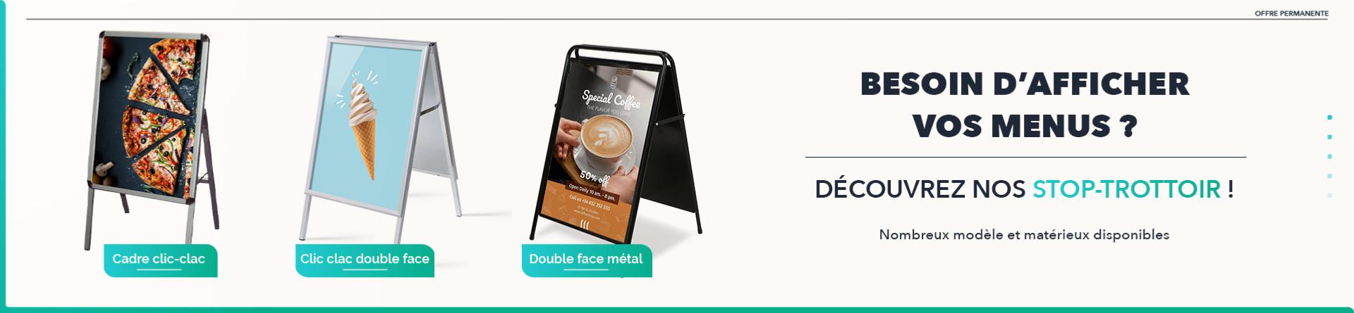 Que vous ayez besoin de mettre en avant vos offres promo devant votre boutique avec un stop-trottoir, ou de mettre à disposition de vos clients vos menus restaurant avec nos portes menu sur pied et porte menu plexi de table , toutes les solutions pour développer votre communication vous sont apportées par signa-print.