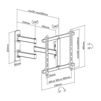 Le support mural pour ecran TV  est conçu pour accueillir un écran de télévision de 32 à 55 pouces répondant aux standards VESA (200x200 min, 400x400 max). Doté d'un système d'orientation à double bras supportant jusqu'à 50 kg, il vous permet d'incliner (+5/-10°) et d'orienter votre écran (180°) selon votre besoin, et de l'écarter du mur de seulement 5,9 cm (support replié) à 59 cm (support déplié), afin de vous donner une grande amplitude de mouvement. Moderne et fonctionnel, le support ecran tv mural  peut s'intégrer dans toutes les pièces de votre intérieur pour vous apporter le meilleur confort d'utilisation.