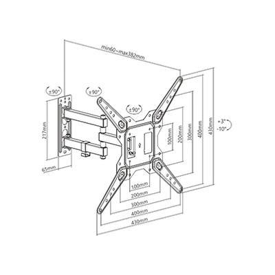 Le support mural pour ecran TV est conçu pour accueillir un écran de télévision de 23 à 55 pouces répondant au standard VESA (100x100 min, 400x400 max). Doté d'un système d'orientation à double bras supportant jusqu'à 30 kg, il vous permet d'incliner (+3/-10°) et d'orienter votre écran (180°) selon votre besoin, et de l'écarter du mur de seulement 6 cm (support replié) à 38,2 cm (support déplié), afin de vous donner une grande amplitude de mouvement et d'accéder facilement à sa partie arrière. Moderne et fonctionnel, ce support ecran peut s'intégrer dans toutes les pièces de votre intérieur pour vous apporter le meilleur confort d'utilisation.