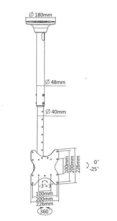 Doté d'un mat télescopique réglable en hauteur , il est aussi orientable gauche droite de 360 ° et inclinable de +/- 25° ce support écran video est une fixation plafond très pratique pour s'adapter à tous vos besoins afin de vous procurer le meilleur confort de vision