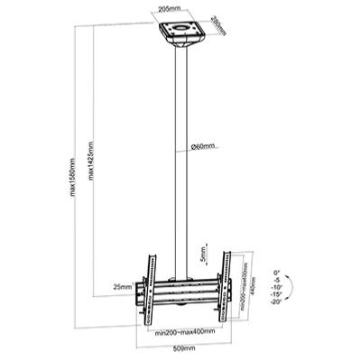Le support plafond inclinable pour ecran TV  est destiné à accueillir un écran de télévision de 43 à 75 pouces répondant aux standards VESA (100x100mm min, 400x400mm max), jusqu'à 50 kg.