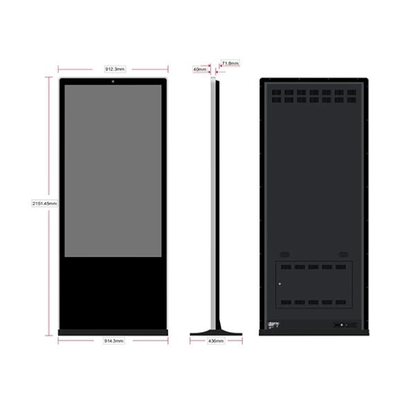 Ce totem vidéo de dimensions 1 900 x 1000 x 430 mm est composé à la fois d'acier, d'aluminium et de verre trempé pour l'écran. Son orientation portrait lui offre un faible encombrement au sol pour affichage grand format de 140 cm de diagonale. Ce totem vidéo multimédia répond parfaitement aux exigences d'un affichage dynamique avec ses 16,7 millions de couleurs. D'une simplicité à tout épreuve, le système Plug and Play intégré vous permet une navigation simplifiée via la télécommande comprise avec le totem.